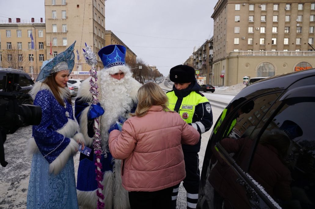 Стражи дорожного порядка вместе с зимним волшебником и его внучкой поздравили автомобилистов, а также напомнили горожанам о важности соблюдения ПДД.