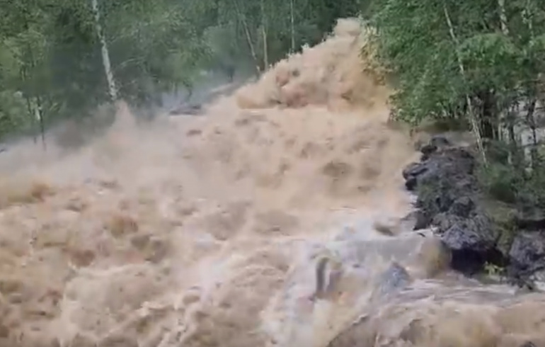 Жители посёлка Межевой Саткинского района и случайные свидетели наблюдают пугающую картинку: из-за ливня река Каменка раздулась и вышла из берегов.