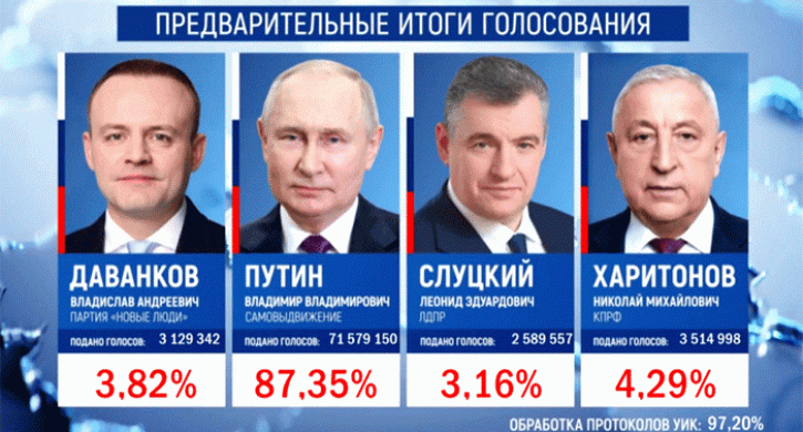Владимир Путин лидирует на выборах президента РФ с 87,35% голосов после обработки 96,45% протоколов, передает корреспондент Агентства новостей «Доступ».