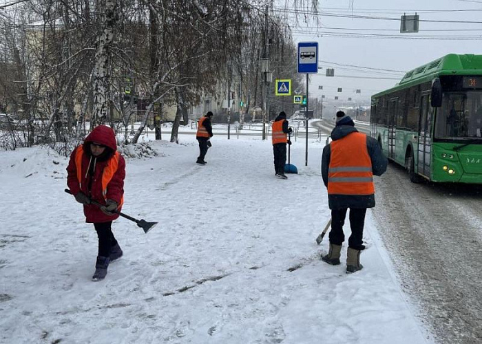 Рабочие расчищают остановки от снега. Фото предоставлено администрацией Челябинска