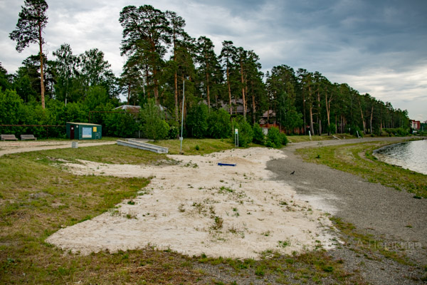 Видно, что завезён свежий песок, но уж как-то маловато его для такой площади, в итоге получился небольшой желтенький оазис. Кому не хватит места, придётся лежать на гальке, траве или просто голой земле.
