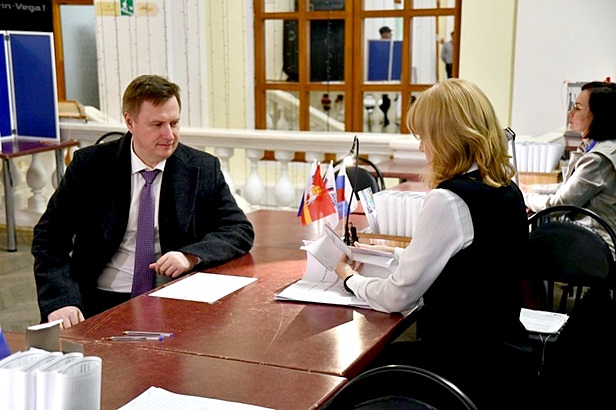 Глава округа Евгений Щербаков 15 марта находится на рабочем месте, но, чтобы не откладывать своё участие в выборах, он пришёл проголосовать в обеденный перерыв. Избирательный бюллетень глава округа получил в 13:00 часов. В соответствии с процедурой он сделал отметку напротив своего кандидата и прошел к избирательной урне.